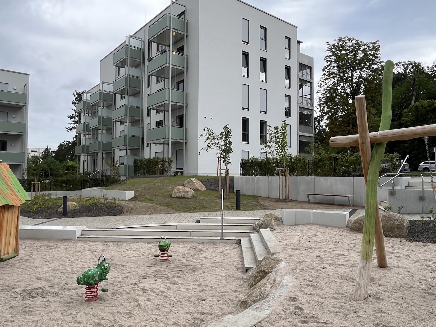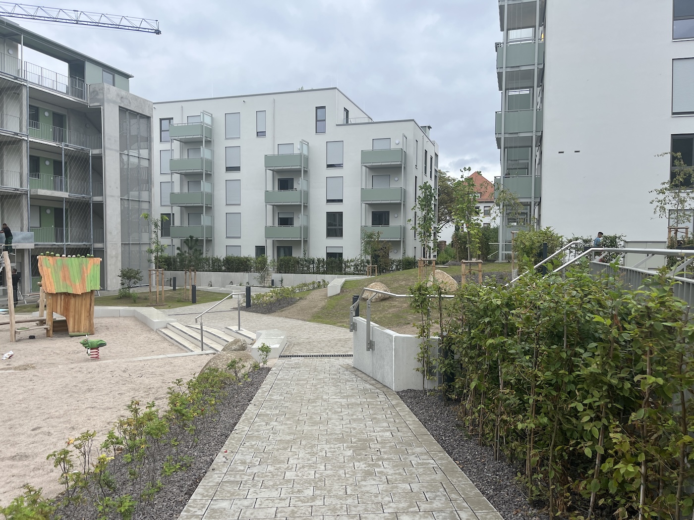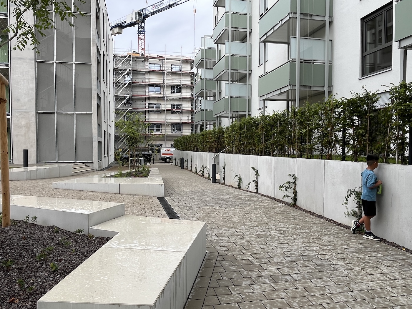 Für diesen hochverdichteten Geschoßwohnungsbau spielen die Freiräume eine besondere Rolle.