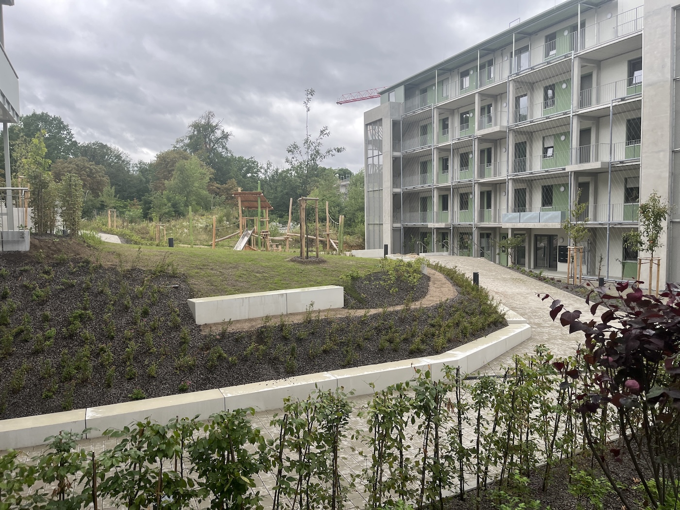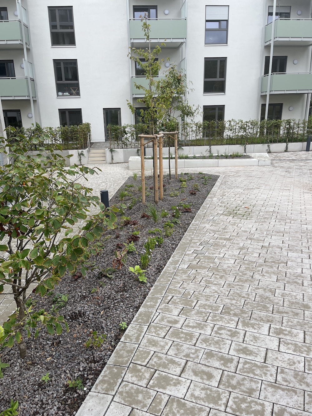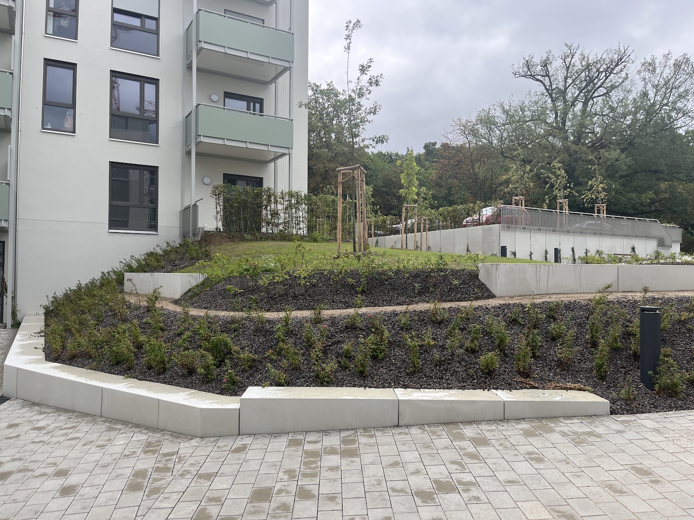 Für diesen hochverdichteten Geschoßwohnungsbau spielen die Freiräume eine besondere Rolle.